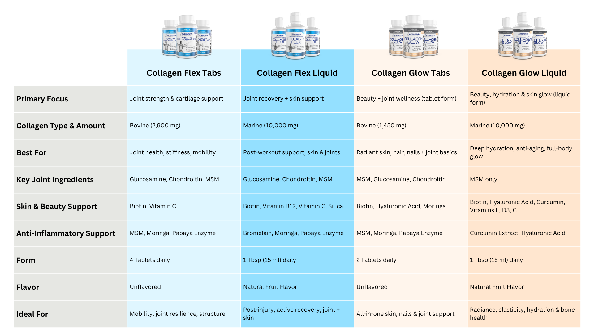 Check out our easy comparison chart and discover which collagen product is right for your lifestyle.