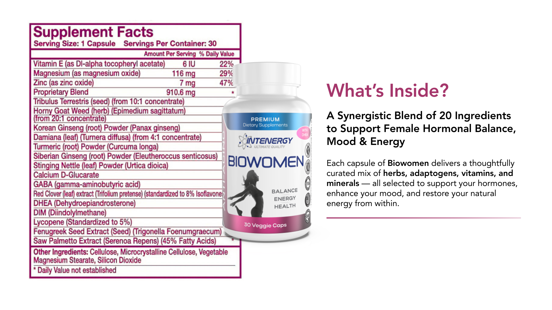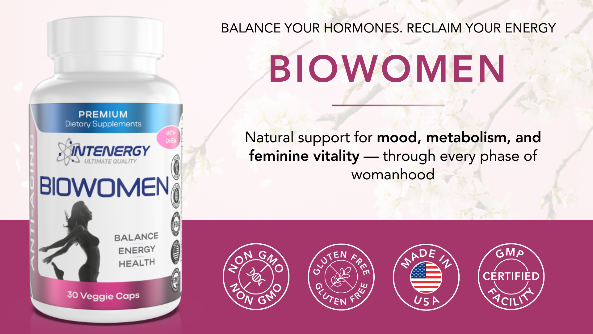 Hot flashes, night sweats, brain fog, and low libido don’t have to be your “new normal.” Biowomen helps support hormonal transitions with ingredients like red clover, DIM, and DHEA — promoting clarity, comfort, and confidence through every phase.