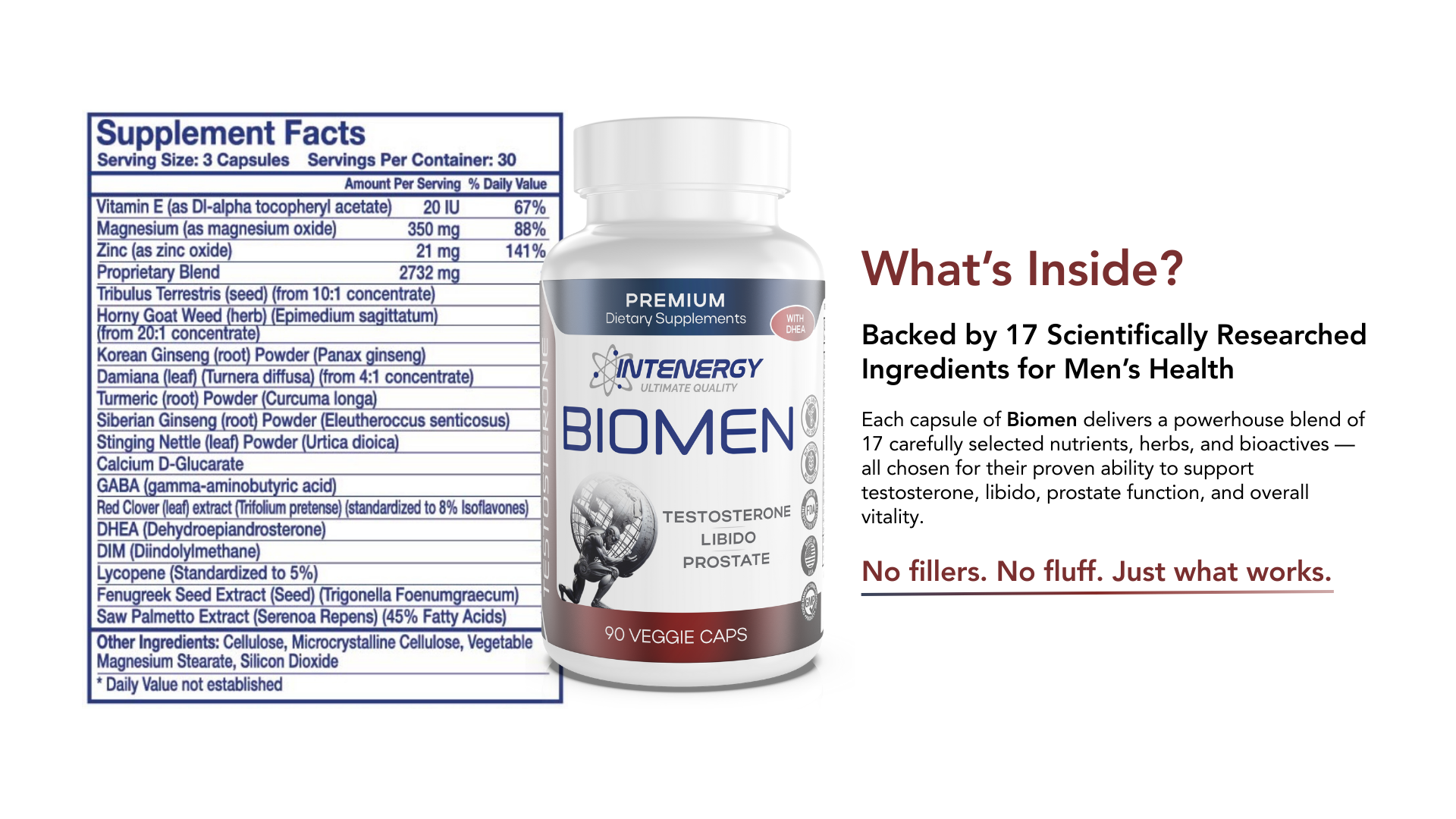 Aging, stress, and lifestyle can take a toll on a man's vitality — but you don’t have to accept it. Biomen™ is an advanced daily supplement designed to help you feel energized, confident, and fully in control again.